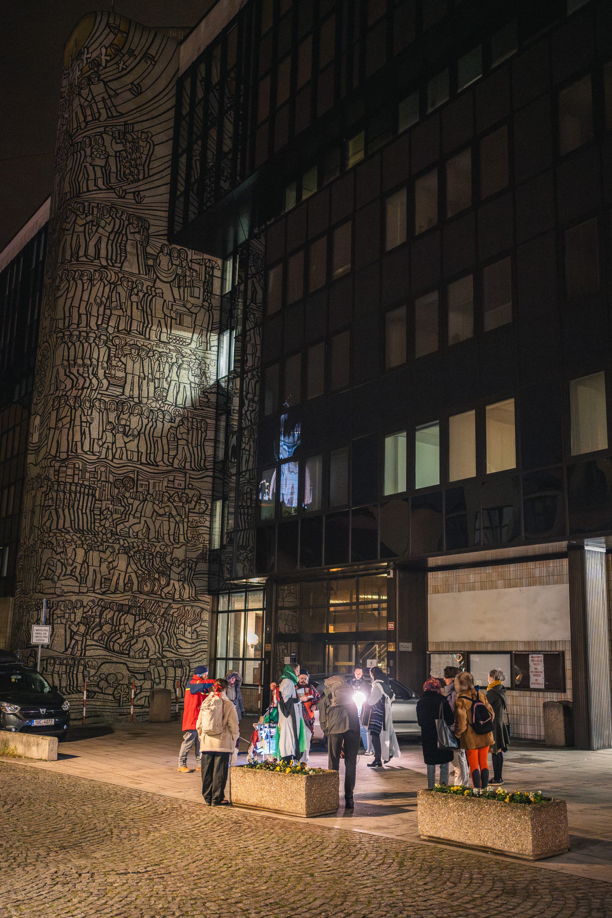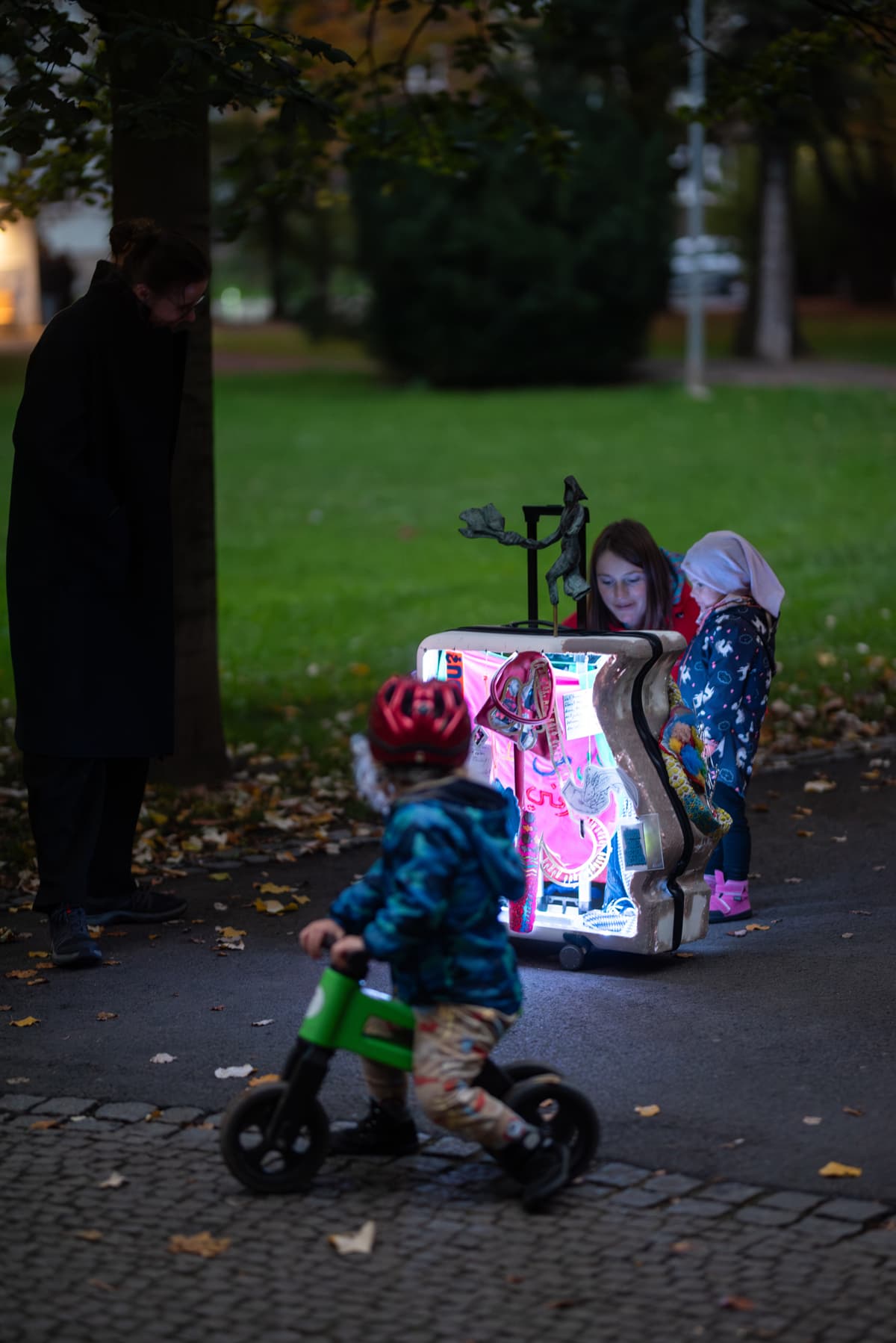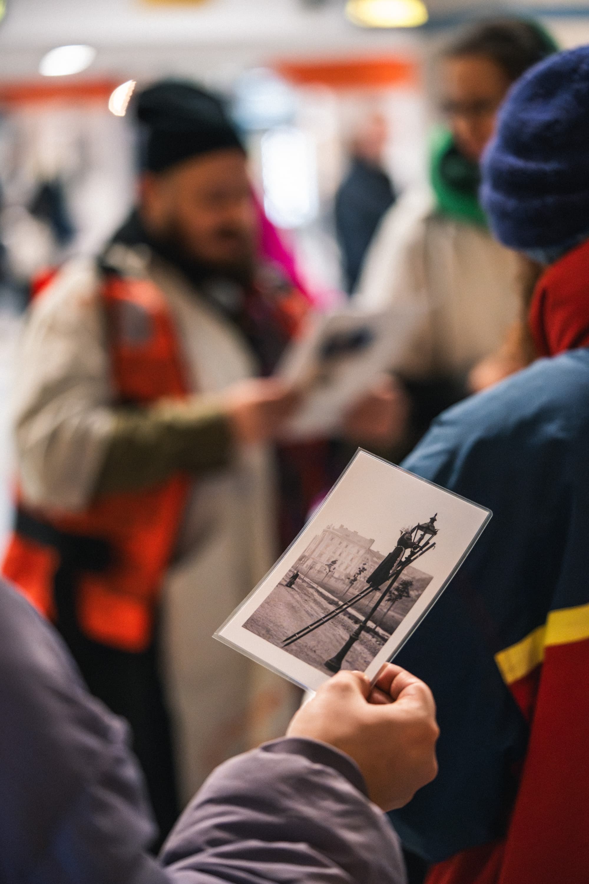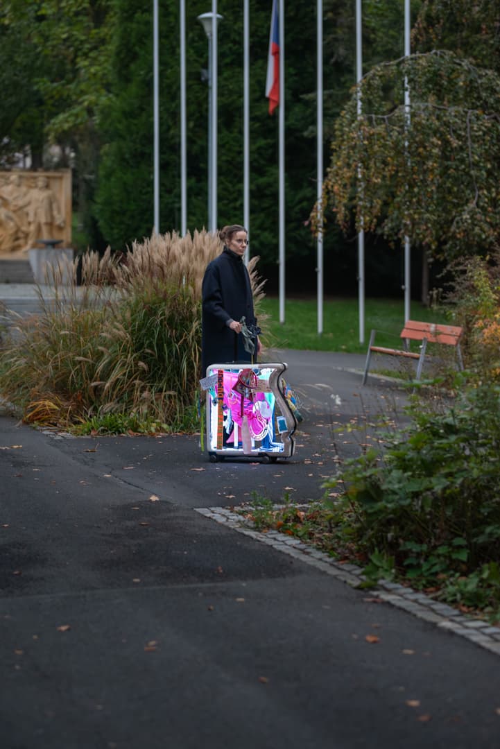 The city walk, hosted by the Memory Person performers Polina Kathsenka, Jegor Kondratyuk, and Franziska Windolf, begins at the central station and rounds off at the House of Arts. The walk features a modified lightbox suitcase, which serves as a central element of the performance.
