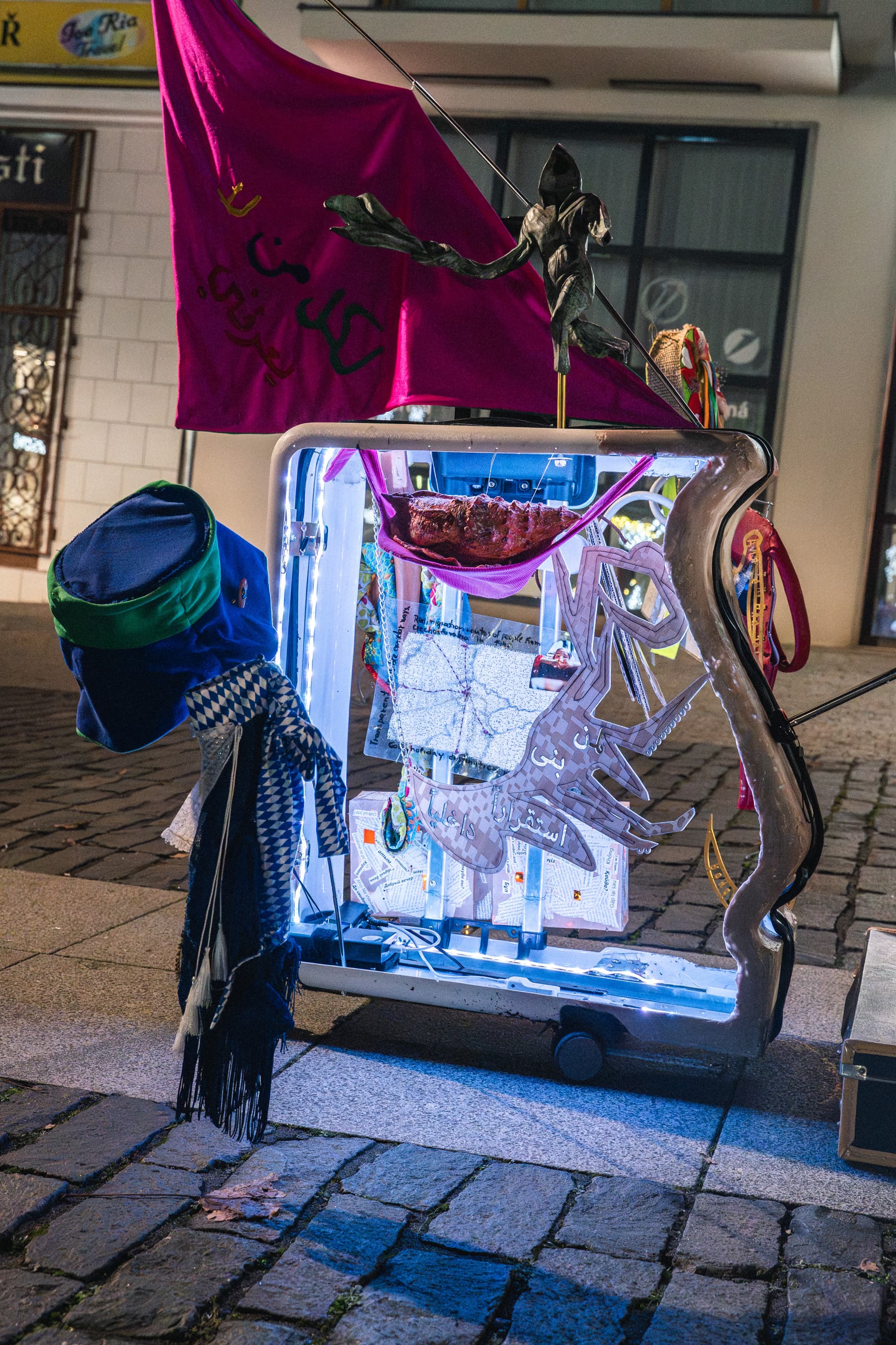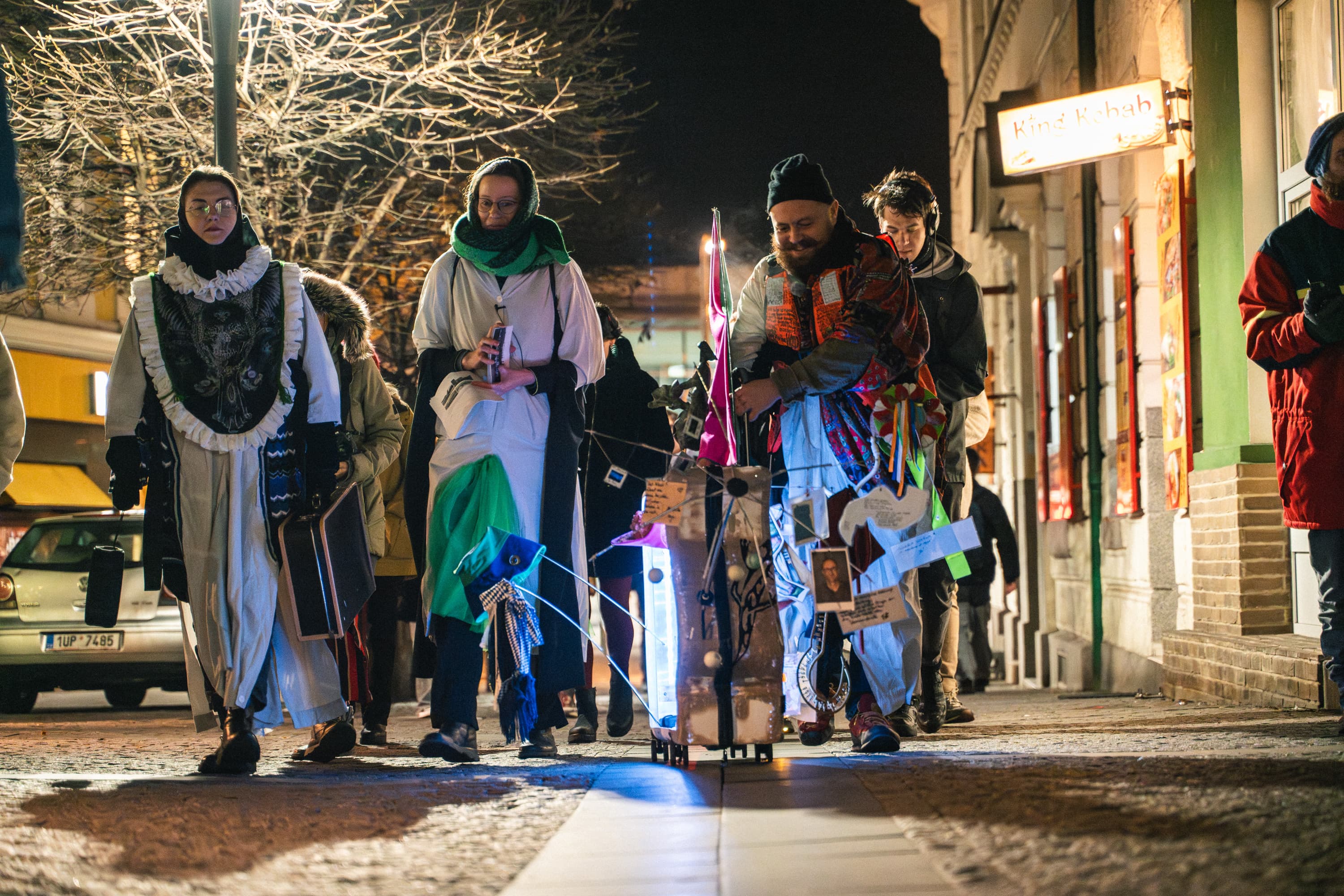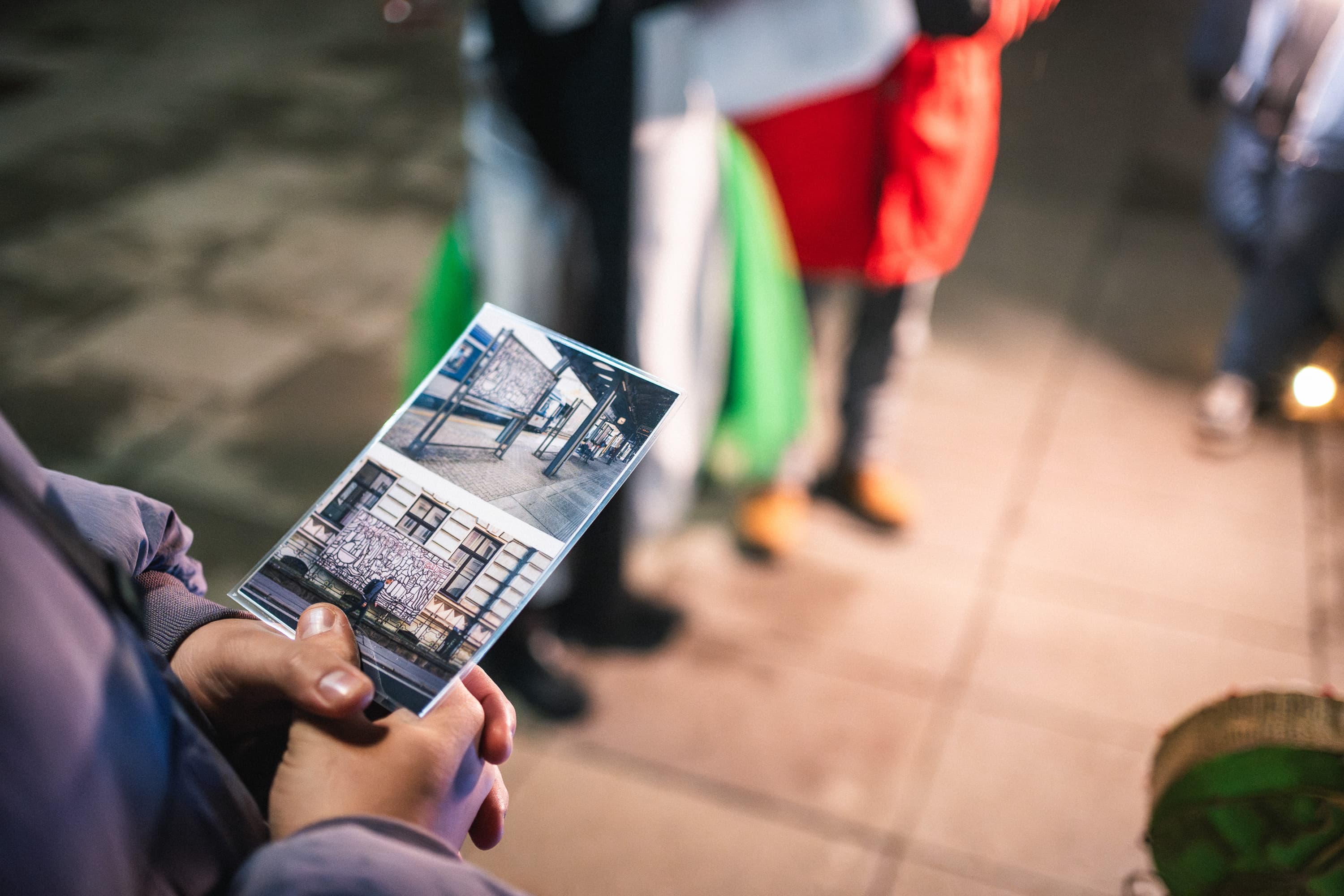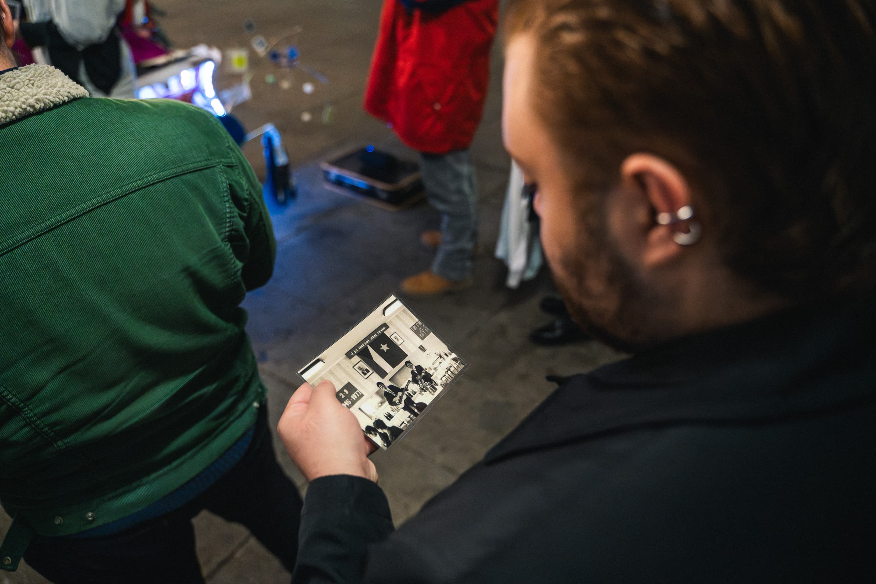 The city walk, hosted by the Memory Person performers Polina Kathsenka, Jegor Kondratyuk, and Franziska Windolf, begins at the central station and rounds off at the House of Arts. The walk features a modified lightbox suitcase, which serves as a central element of the performance.