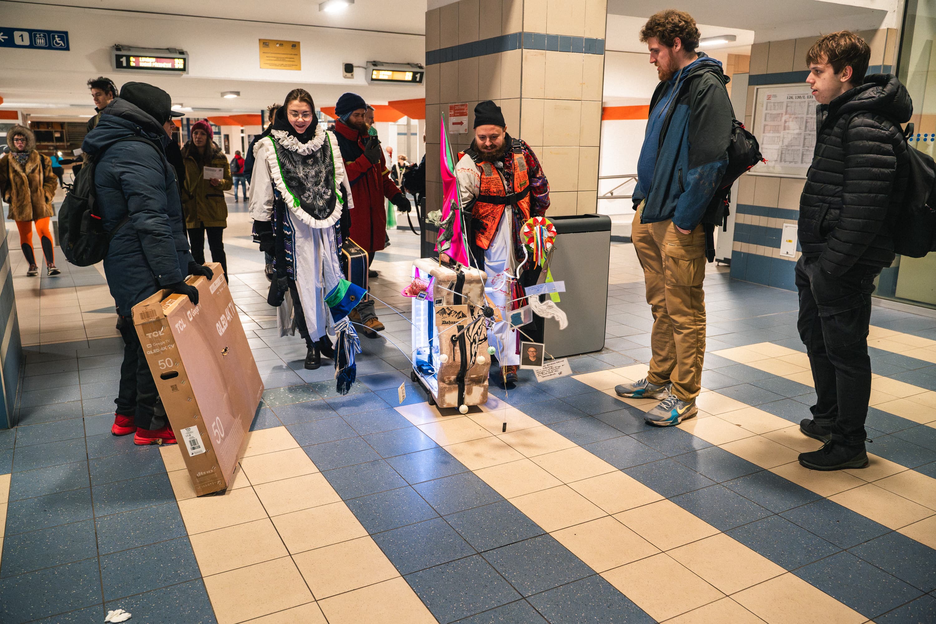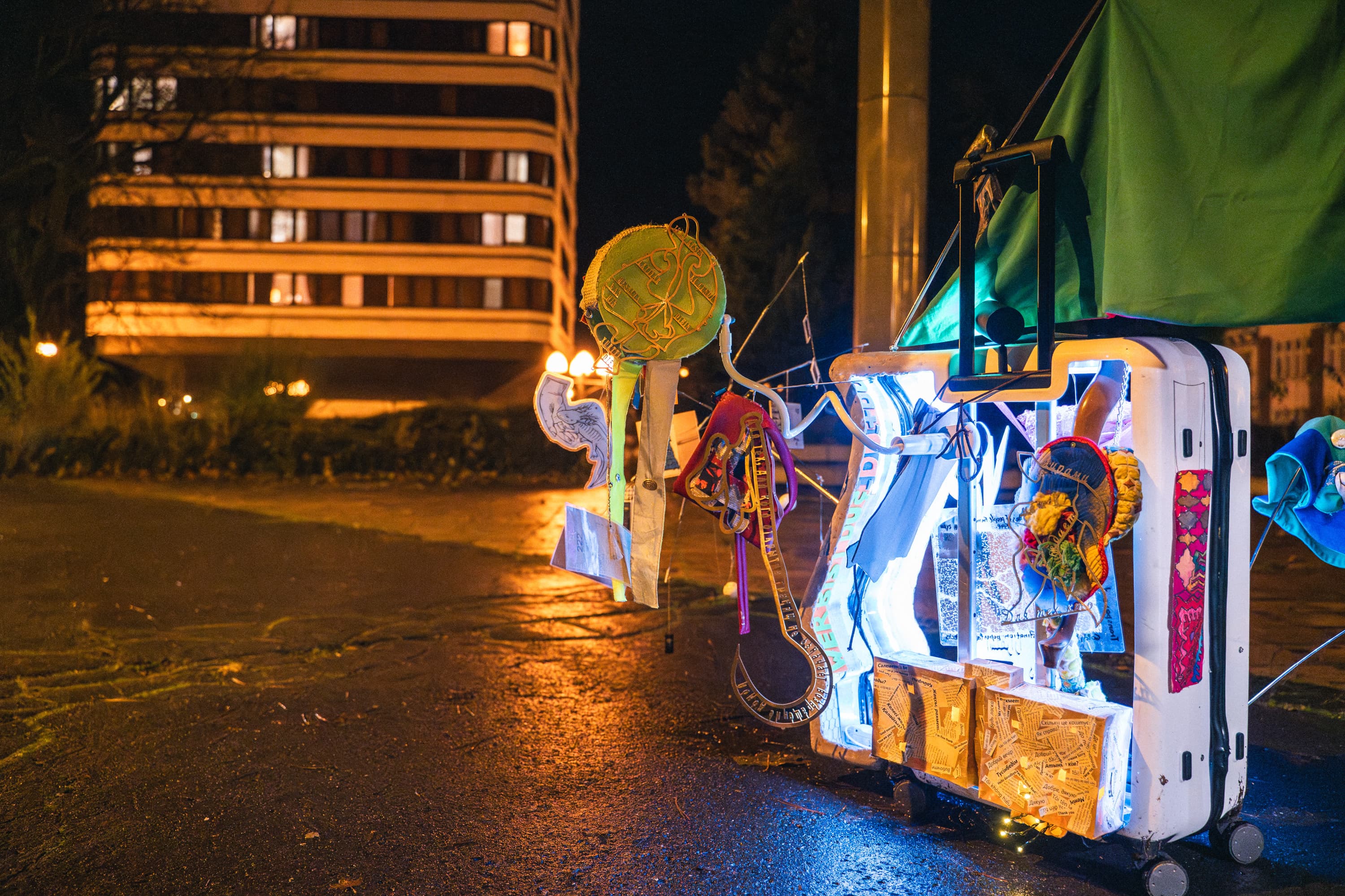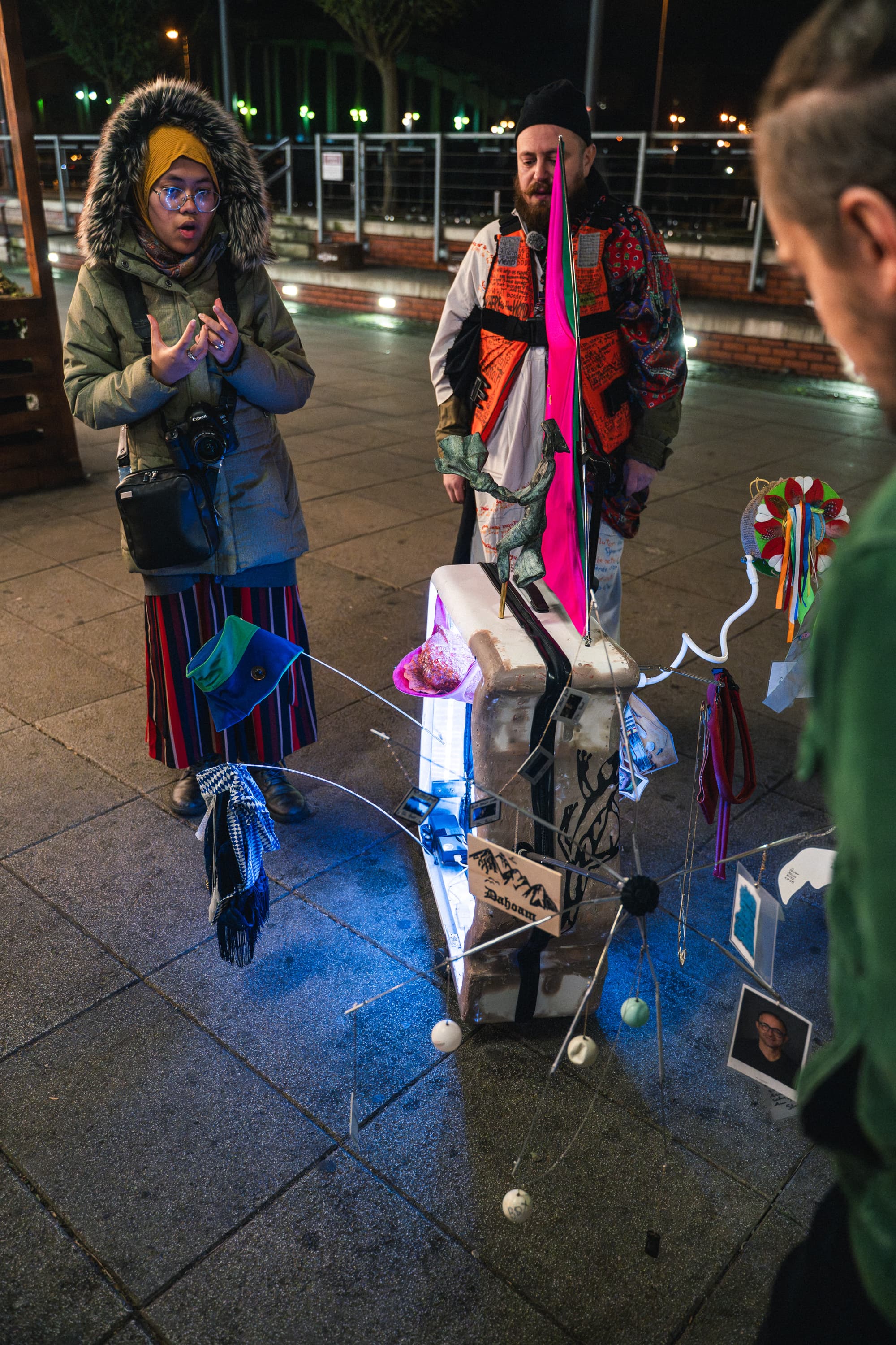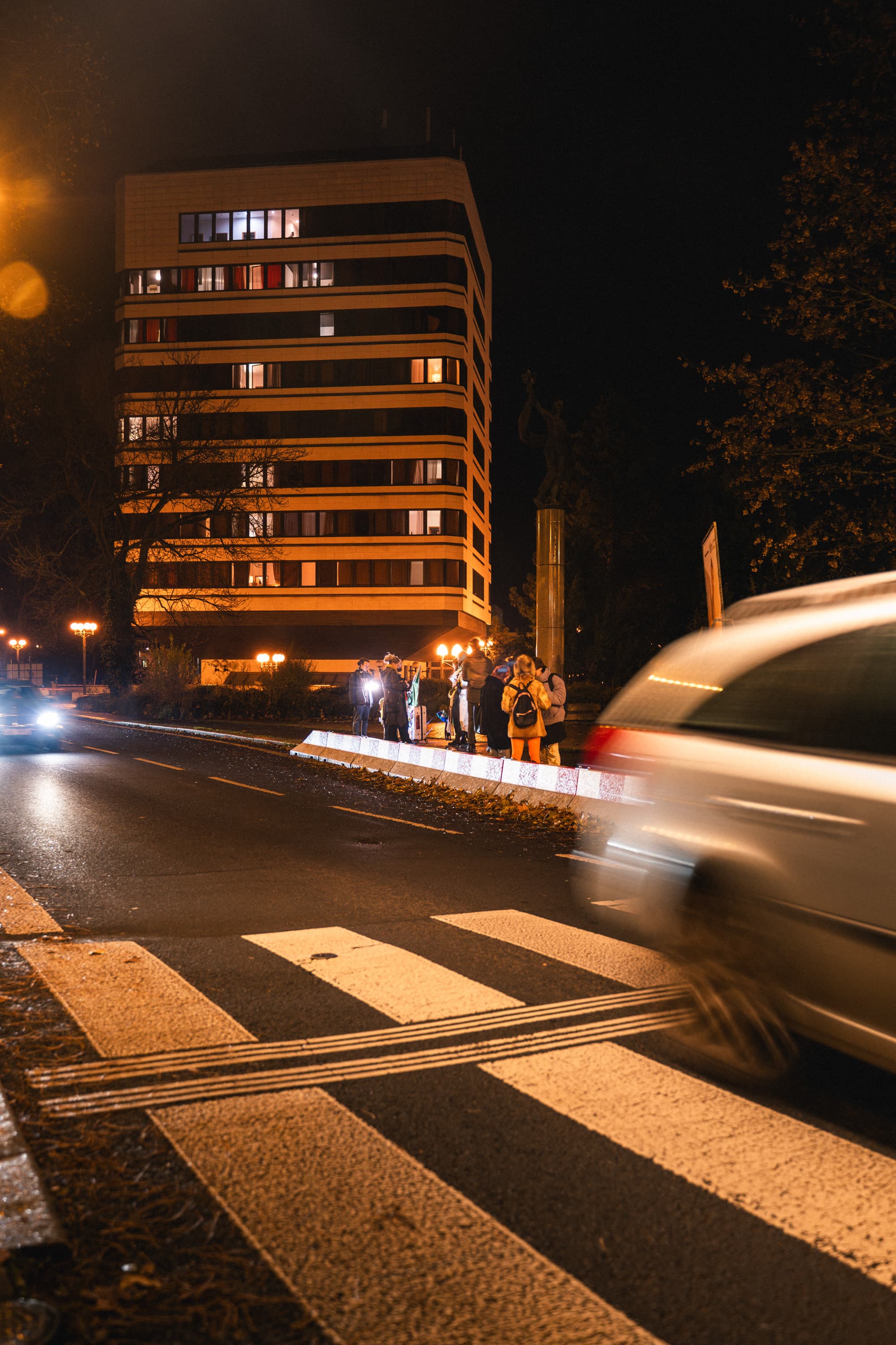 The city walk, hosted by the Memory Person performers Polina Kathsenka, Jegor Kondratyuk, and Franziska Windolf, begins at the central station and rounds off at the House of Arts. The walk features a modified lightbox suitcase, which serves as a central element of the performance.