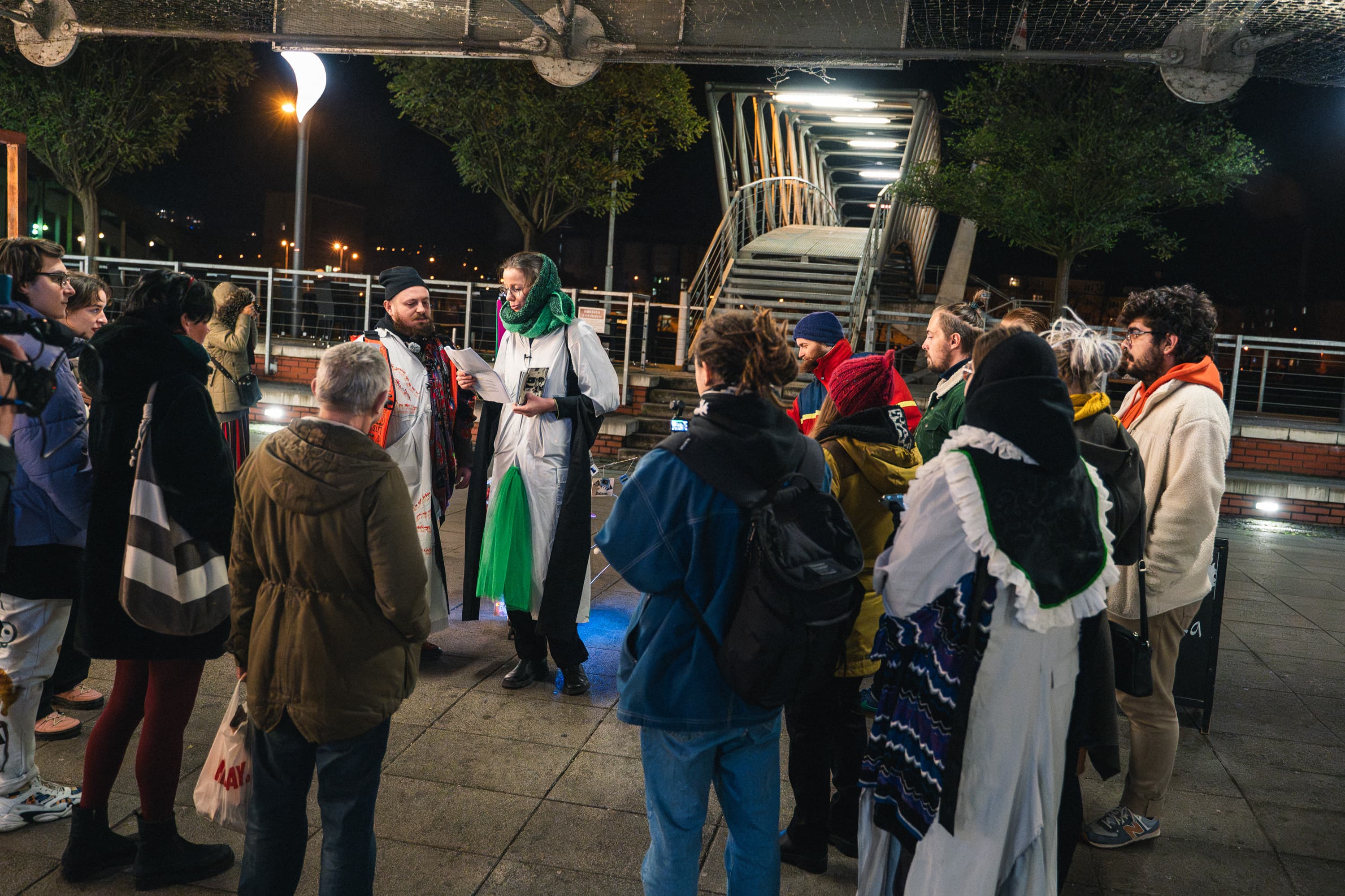 Franziska Windolf, drawing upon her research engaged in during the residency period, introduces the historical significance of various sites along the walk.