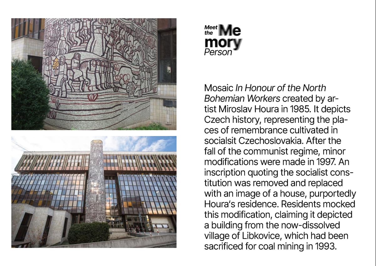 After 1989, residents of Ústí nad Labem began to reject propagandistic monuments. For example, in December 1989, students painted the statue of Klement Gottwald in the park named after him. This statue was torn down in January 1990. This led to questions regarding the fate of the monumental mosaic, titled “In Honour of the North Bohemian Workers,” created by artist Miroslav Houra in 1985. Covering an area of 450 m², the mosaic represents the places of remembrance cultivated in socialist Czechoslovakia. The central monument was primarily designed to provide reassurance and orientation within a history defined as both Czech and socialist.